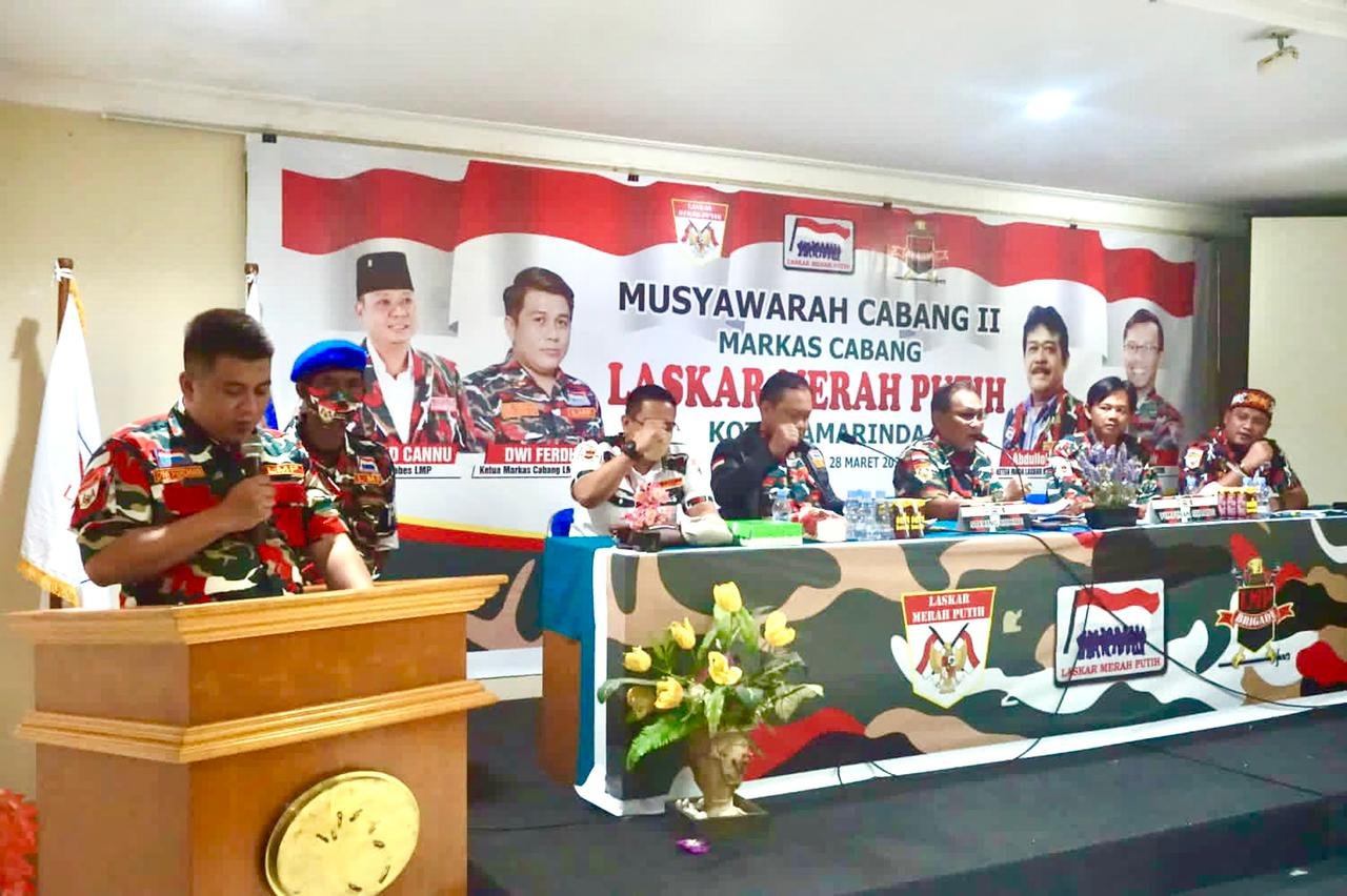 Samarinda – Laskar Merah Putih (LMP) Cabang Samarinda menggelar Musyawarah Cabang (Muscab) II Tahun 2022 di Hotel Voiland Garden Samarinda, Minggu (27/3/2022).