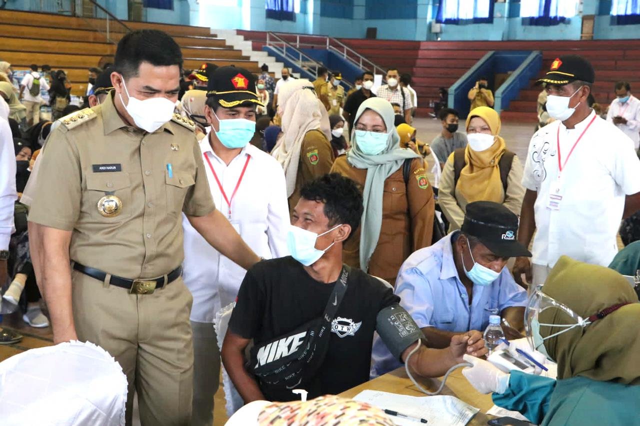 Samarinda – Wali Kota Samarinda Andi Harun menghadiri vaksinasi massal Covid-19 tahap pertama kepada 1000 masyarakat yang diselenggarakan Dewan Pengurus Cabang (DPC) Partai Gerakan Indonesia Raya (Gerindra) setempat di Gor Segiri, Selasa (29/9/2021).