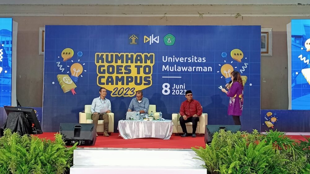 SAMARINDA : Kementrian Hukum dan Hak Asasi Manusia Republik Indonesia (Kemenkumham RI), menggelar kegiatan “Kumham Goes To Campus” tahun 2023 di Universitas Mulawarman (Unmul) Kota Samarinda, Kalimantan Timur, Kamis (8/6/2023).