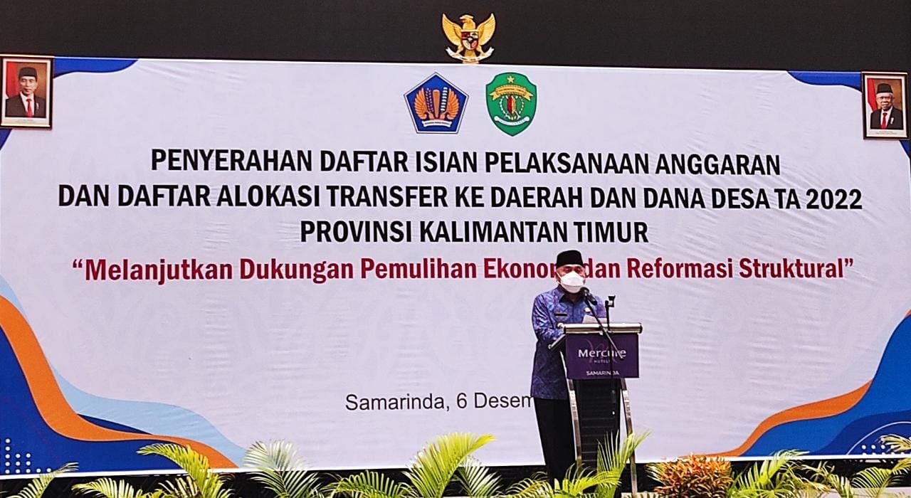 Samarinda – Pemerintah Provinsi Kalimantan Timur (Kaltim) melakukan penyerahan Daftar Isian Pelaksanaan Anggaran (DIPA) dan daftar alokasi Transfer ke Daerah dan Dana Desa (TKDD) Tahun Anggaran (TA) 2022 di Hotel Mercure Samarinda, Senin (6/12/2021).