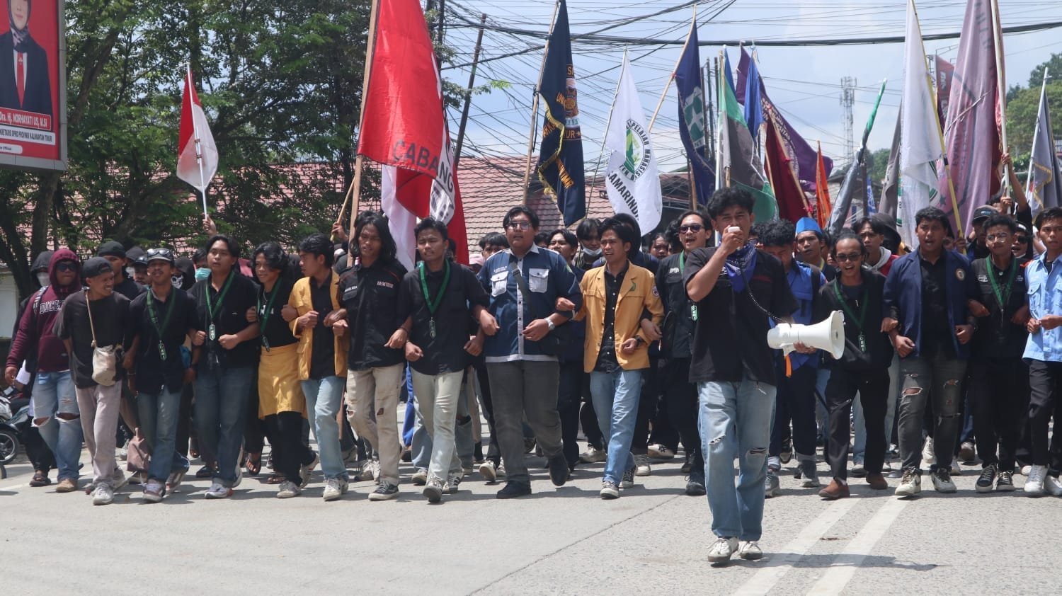 Aksi yang berlangsung sejak siang itu diwarnai dengan lautan bendera organisasi mahasiswa, spanduk tuntutan, hingga orasi bergantian dari atas mobil komando.