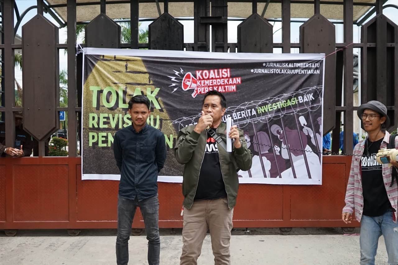 Di Kalimantan Timur (Kaltim) puluhan jurnalis berunjuk rasa di depan Gedung DPRD Kaltim dengan membawa poster-poster yang menyuarakan penolakan terhadap draf Rancangan Undang-Undang (RUU) Penyiaran, Rabu (29/5/2024).
