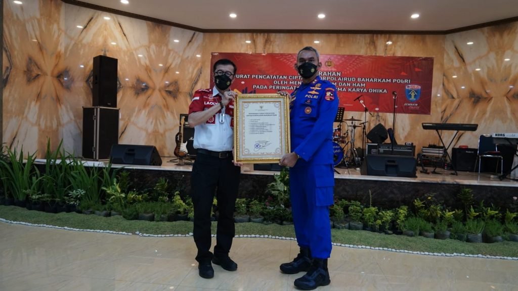 Samarinda – Menteri Hukum dan Hak Asasi Manusia (Menkumham) Yasonna H Laoly, menyerahkan sembilan Kekayaan Intelektual (KI) kepada Kepala Korps Kepolisian Perairan dan Udara Badan Pemeliharaan Keamanan Kepolisian Republik Indonesia (Korpolairud Baharkam Polri), Verdianto I Bitticaca di Markas Komando Korpolairud Baharkam Polri, Jakarta Utara, Selasa (26/10/2021).